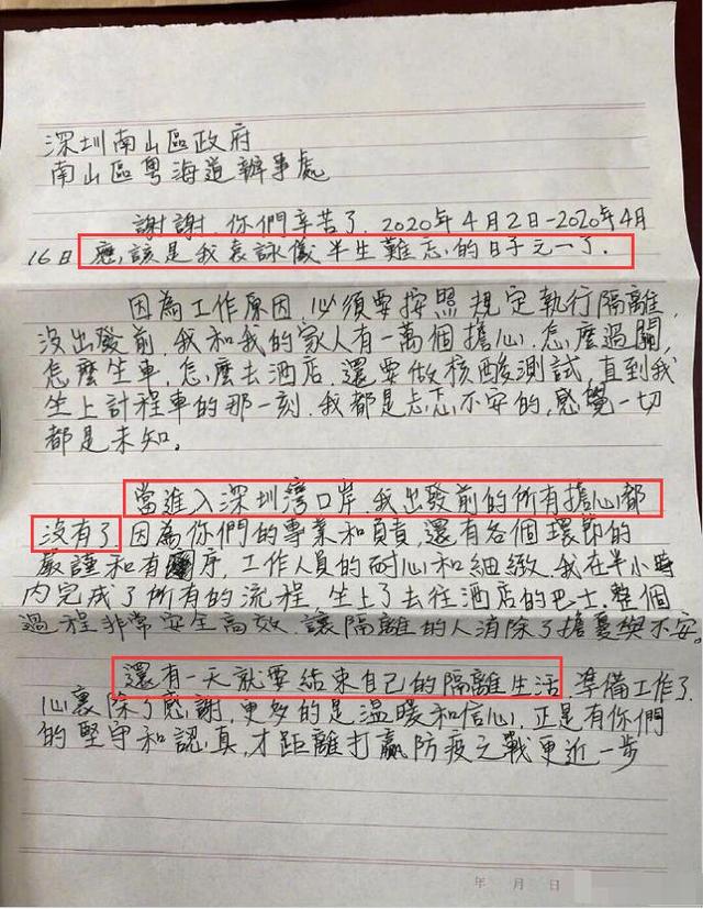 原来她因为工作原因需要执行隔离,在到深圳湾口岸前心中一直非常忐忑,完全不知道该怎么做。但是直到到了口岸后一切担心都没有了,因为口岸的工作人员非常专业和负责,耐心又细致,各个环节严谨有序。她赞扬整个检查过程,半个小时就完成了所有的流程,让她完全打消了顾虑。