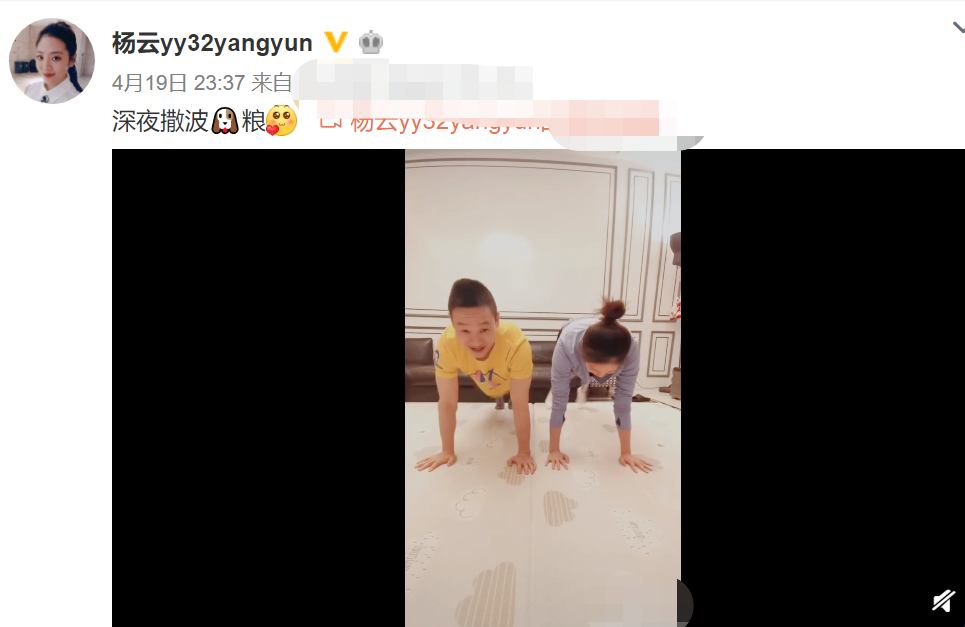 4月19日深夜,体操女神杨云在个人社交平台晒出了一段和老公杨威花式锻炼身体的视频,并配文深夜撒狗
