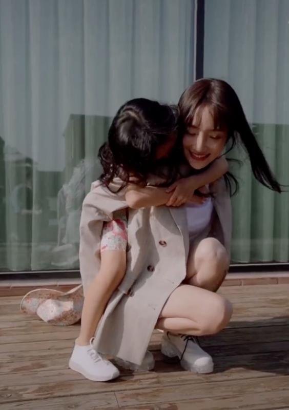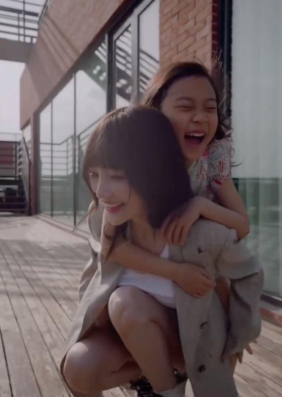 活泼可爱的甜馨依旧不改小时候的魔性笑声,从后面一路跑来扑到妈妈背上,紧紧搂住对方的脖子。