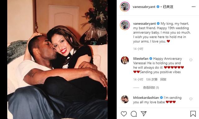 4月19日,科比的妻子瓦妮莎在社交网站上晒照,庆祝今天是两人结婚19周年的纪念日,并且配文表示:“结婚纪念日,我的科比送来的花朵