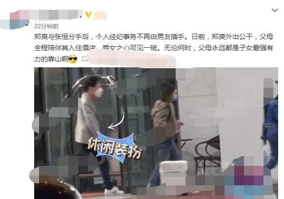 4月19日上午,某媒体发文报道:郑爽与张恒分手后,个人经纪事务不再由男友插手。日前,郑爽外出公干,父母全程陪伴其入住酒店,爱女之心可见一斑。无论何时,父母永远都是子女最强有力的靠山!