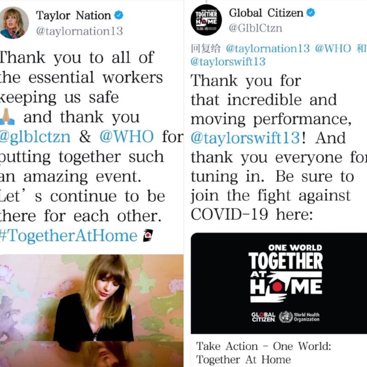 4月19日,“霉霉”泰勒·斯威夫特的官方团队Taylor Nation发文感谢“一个世界,一同宅家(One World: Together At Home)”特别慈善音乐会的主办方,表示“谢谢每个保护我们安全的抗疫工作者,还要感谢glblctzn和WHO举办这个特别的演唱会,让我们继续彼此支持吧!”随后,世界卫生组织与国际公益组织“全球公民运动”Globel Citizen转发了这条博文。