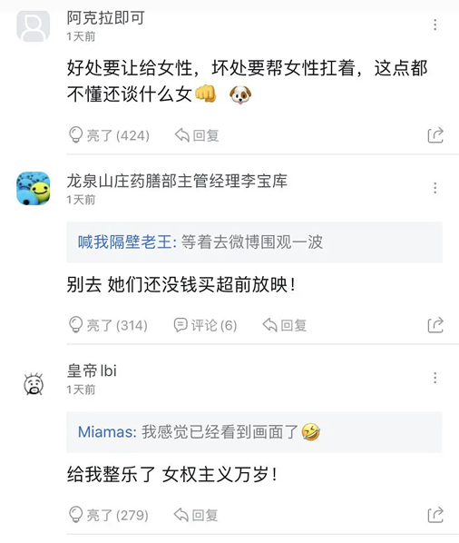 拥趸者们表示编剧是在“嘲讽伪女权”,