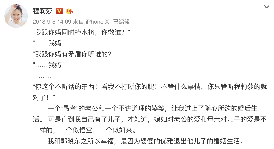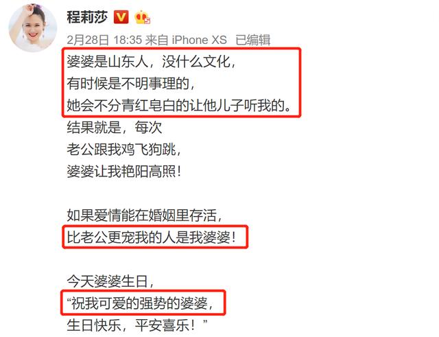 2月28日,程莉莎为可爱又强势的婆婆庆祝生日并发文称,婆婆是山东人,没什么文化,总是让儿子不分青红皂白地听自己的,比老公更宠爱自己。