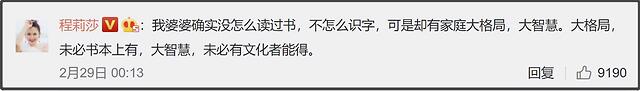 程莉莎本人也意识到了,表述不当可能会引发误解,重新修改编辑了发文,但是随后又更改了回来,并在评论中补充道,婆婆确实没读过书,不怎么识字,但是却有家庭大智慧、大格局。