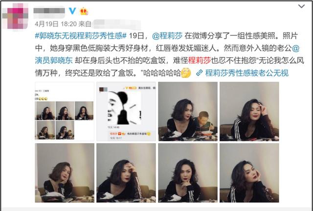 4月19日,演员程莉莎发文抱怨道,老公郭晓冬只管专心吃盒饭,丝毫不顾及身边风情万种的自