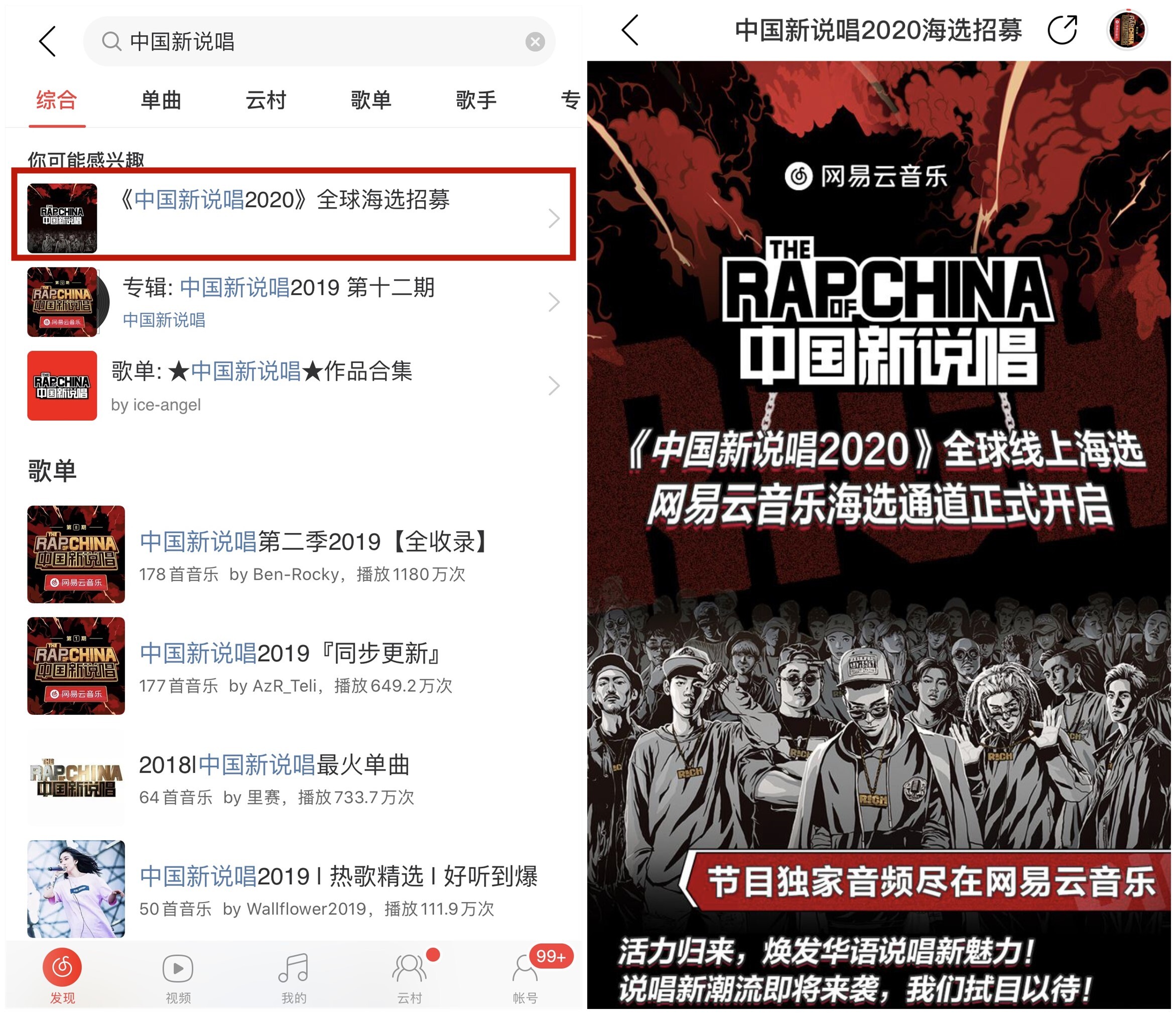 4月18日至5月9日,只要打开网易云音乐搜索“中国新说唱”,即可找到《中国新说唱2020》网易云音乐海选专属通道报名链接,点击进入并上传参赛作品——时长在60-180秒内的视频,即可报名。此外,与常规通道不同的是,在网易云音乐海选专属通道报名的音乐人,至少有2位有机会到体育馆海选现场参与明星制作人面对面考核录制,并有1个直通60秒的名额。