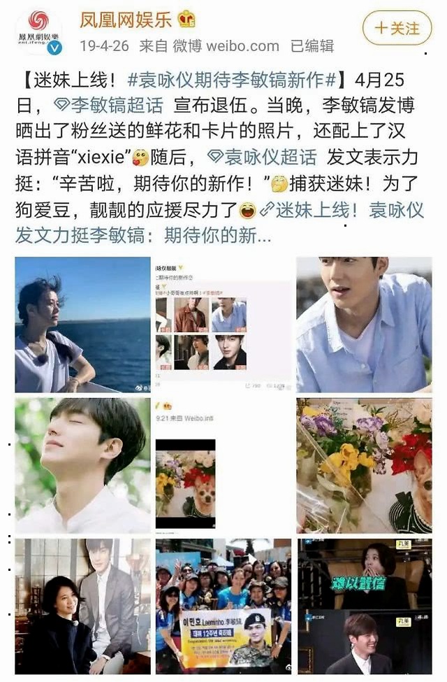 去年4月李敏镐前脚在社交平台宣布退伍,靓靓的应援就“马不停蹄”地赶来了。欧巴的魅力无人能挡,作为靓靓的本命爱豆,一粉就是好多年,简直可以算是会长级的迷妹。