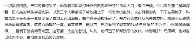 又比如,巴克亲眼看到一只叫科雷的狗被同类撕成碎片,这一幕让它难以忘怀,反复入梦、心惊胆战。