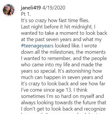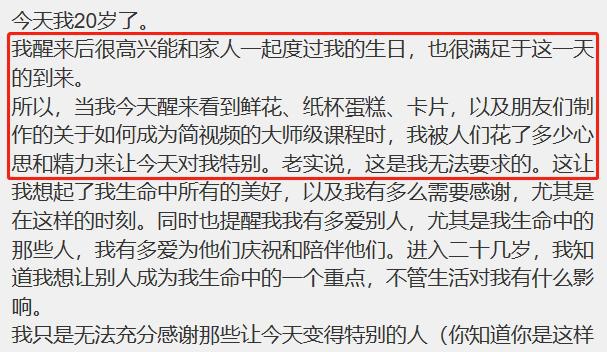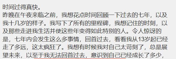 文字第一部分是Jane对自己的剖析,在生日来临时她感叹时间过得好快,回忆了从13岁开始的那7年,最后送上对未来的期许“希望我20多岁的时候能做得更好”。