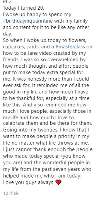她在鲜花、纸杯蛋糕、卡片以及朋友送的视频间醒来,与家人们度过了满足的一天,她知道大家用心让这一天变得特别,她很感动。在Jane的生命中有很多美好,有很多要感谢的人,她说“永远爱你们”。