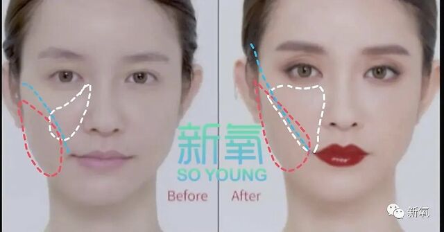其次是中庭,中庭的修饰是轮廓改善中最难的一个部分,因为大多数亚洲人的扁平骨骼在轮廓上的表现为略宽扩还带点高的颧骨。