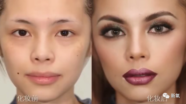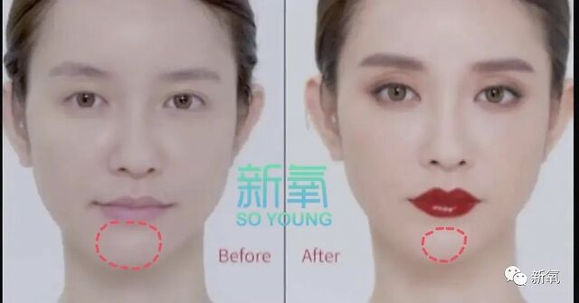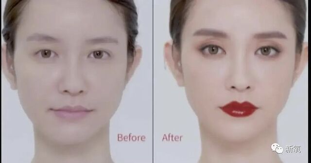 过翘的下巴让下庭的高光点膨胀,对比化妆前后下巴的变化,虽然细微但化妆起到的效果还是挺明显的。