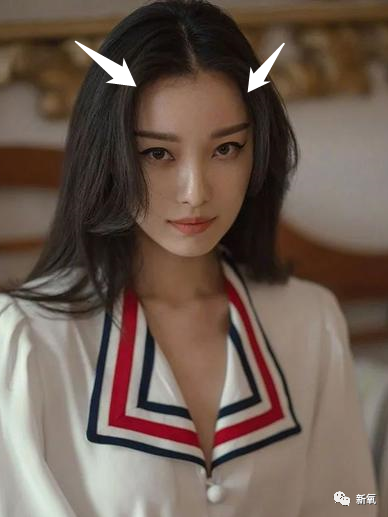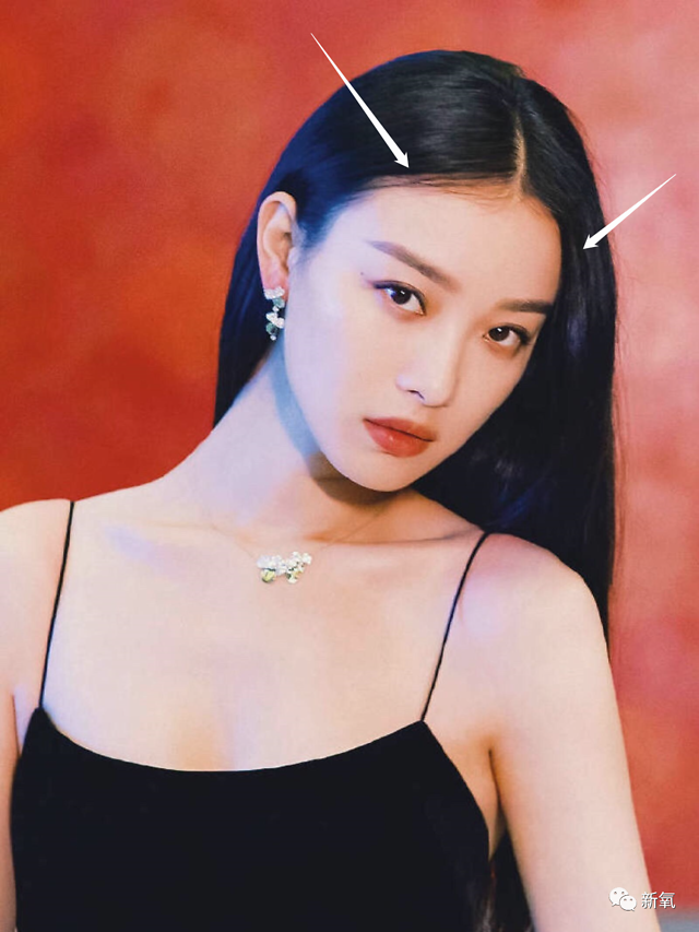 看倪妮这种长方脸型,在额头的修饰就是将鬓角隐去,不管是妆容还是发型,她好看的造型几乎都是弱化额头鬓角的。