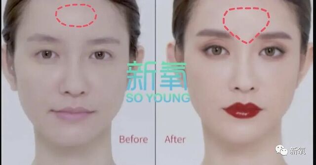 毛老师通过化妆把额头上的这个膨胀点压了下去,顺便把高光点下移到印堂位置让人本身显得亮堂,自然膨胀感削弱,网红感也就消失了。
