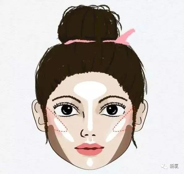 长脸:将阴影色和明亮色糅合在一起,修饰发际线、下巴及脸部的四个角,打造柔和感;眉毛的位置和角度要平缓;