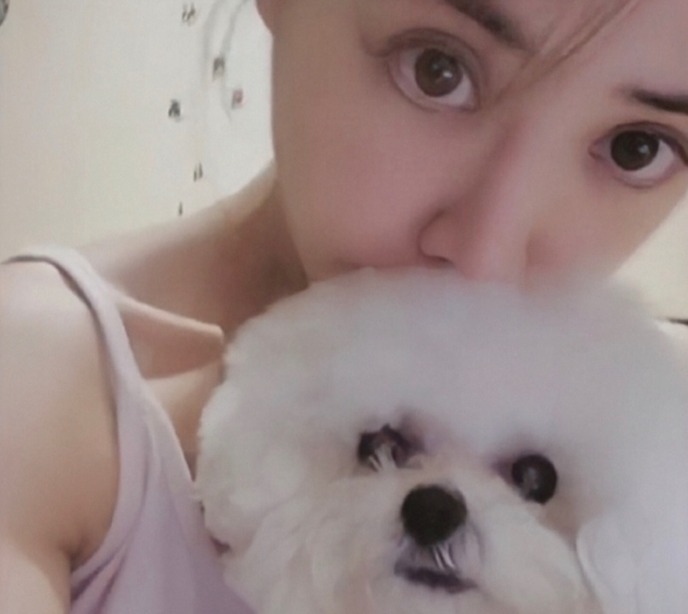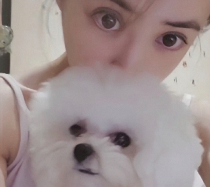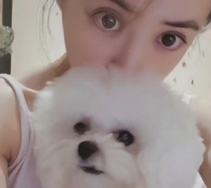 4月20日,蔡依琳在社交平台上秀出与狗狗的自拍合影,照片中她穿着白色吊带瞪眼卖萌,和狗狗十分亲