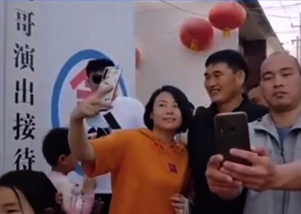 不仅要笑,然后还要配合着和那些围观群众合影拍照。