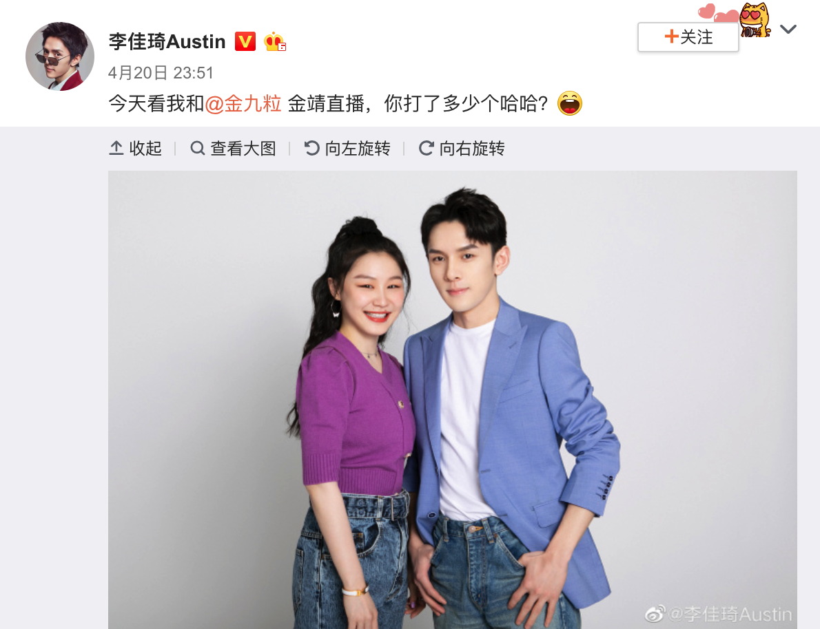 4月20日,李佳琦晒出与金靖的合照,并配文“今天看我和金靖直播,你打了多少个哈哈?”
