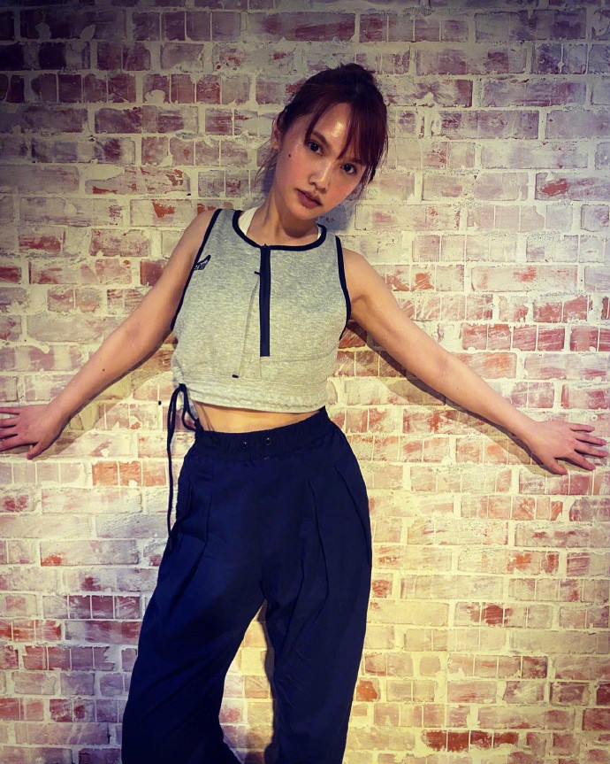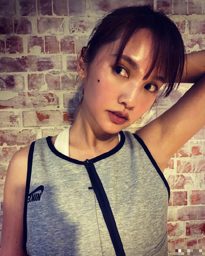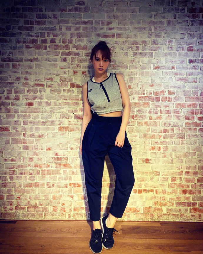杨丞琳穿运动背心,手臂纤细,身材姣好。