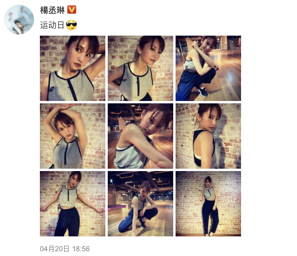 4月20日晚,杨丞琳在社交平台上晒出自己健身时的照片,并配文:”运动日“。照片中,她穿着运动背心,脸颊红润香汗淋