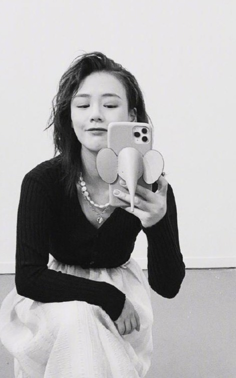 照片中,马思纯披着一头齐肩卷发,黑色上衣配淡粉色公主裙,翘着二郎腿,拿着手机对镜自拍,满屏的粉嫩可爱。马思纯的手机壳是粉色的,上面有一个可爱的大象的装饰,马思纯拿着它自拍,少女感十足。