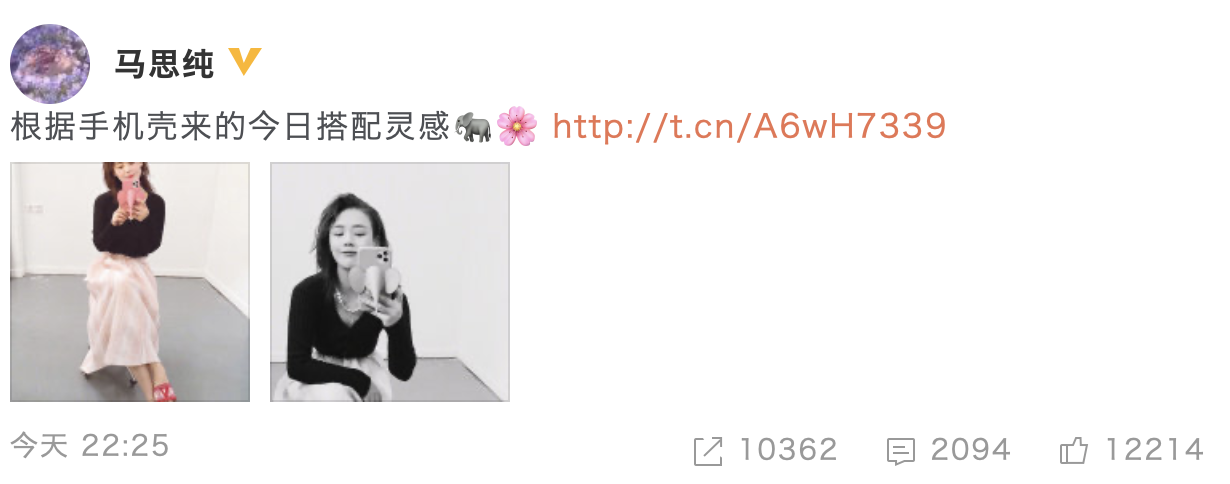 4月20日晚,马思纯在社交平台上晒出两张照片,并配文:“根据手机壳来的今日搭配灵感。”
