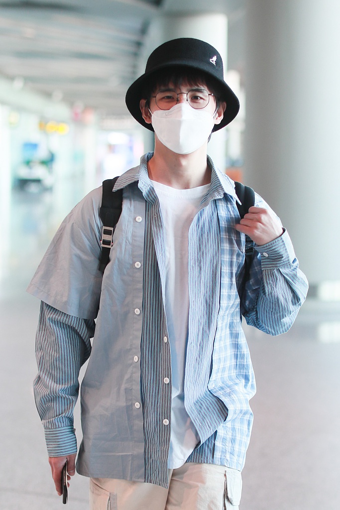 张远戴着渔夫帽,身穿蓝色格子外套搭配板鞋,清爽帅气示范春季穿搭,背着双肩包萌感十足。