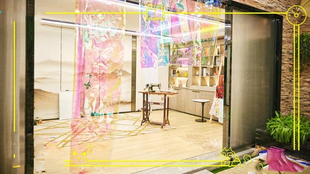房间区域用彩虹糖纸一样的幕帘分割开来,少女心十足,宽敞的空间里能见到一角专门放置着一台老式缝纫机,后面还有一个专门的立架上挂着不同花色的布匹。