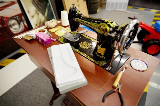 在缝纫机上放置着各种针线和镊子,看得出来郑爽的工具都很专业了。