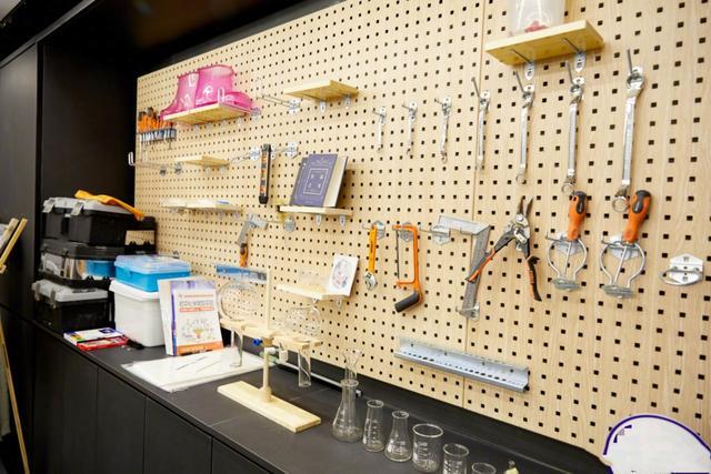 除了实验工作台之外,还有一面墙上整面都挂着各种型号的工具,知道的这是郑爽的新家不知道的还以为是"手工耿"的工作间,不过上面一双粉色的泡脚桶鞋让人觉得有些好笑。