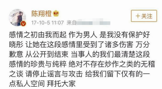 随后,陈翔承认分手,并且向公众致歉,他在文中表示”从公开到结束,当事人的我们最清楚这段感情的珍贵与纯粹,绝对不存在炒作之类的无稽之谈“,同时扬言要对曝光他和江铠同出轨视频者追责。