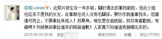 对于媒体爆料,李威发文回应,称照片发生在一年多前,而杨子晴从来不是她的女友,并斥责杨子晴借机炒作,而杨子晴不甘示弱,立即怼了回去:“原来我就是一个被你XXXXX,谢谢你让我看清,去追求你下一任真爱吧!”