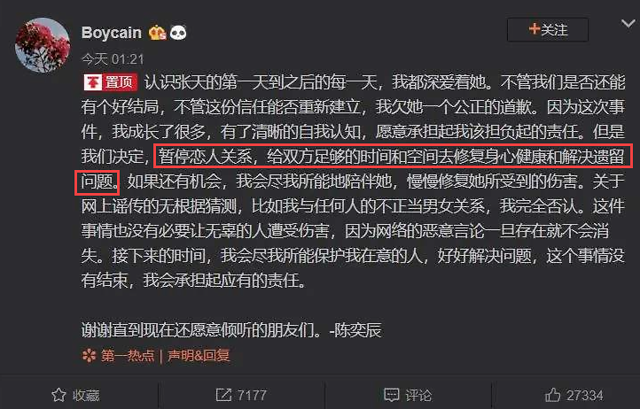 由于内容涉及到私生活,而且尺度很大,为此网友纷纷骂陈奕辰和他的团队“心理扭曲、龌龊、下流”,迫于压力,陈奕辰发文宣布跟张天分手,但是一句”暂停恋爱关系“却成了笑谈。