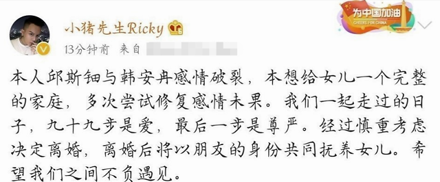 然而好景不长,小猪先生却出轨陈妮妮,为此两人发声明离婚,小猪先生分手声明中那句”我们一起走过的日子,九十九步是爱,最后一步是尊严“遭到网友群嘲,戏剧化的是,两人近日居然复合了!