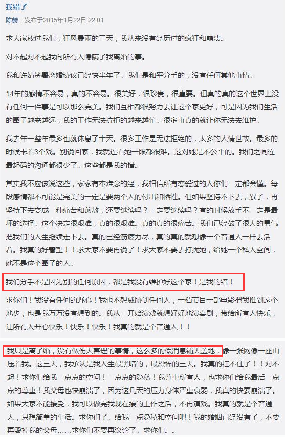 迫于压力,陈赫发文承认离婚,但否认出轨,称“没有做过伤天害理的事情”,离婚只是因为工作太忙缺乏沟通,甚至扬言“如果大家不能接受,我可以做完我现在接的工作之后,不再演戏”,结果他不但没有退出娱乐圈,还娶了张子萱,生了女儿。