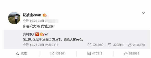 分手之际,阚清子在朋友圈吐槽“我的青春喂了狗”,纪凌尘则以一句”你喜欢大海,我爱过你“回应,该言论引起众怒,纷纷痛斥他是渣男。
