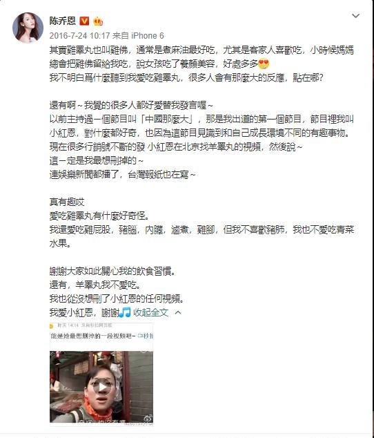 陈乔恩走红后经常被网友扒出早年的心酸成名史,早年陈乔恩参加台湾的综艺节目曾自曝了养颜秘笈和丰胸秘籍,在节目中自曝爱吃鸡睾丸,许多网友对其炮轰,称其喜好怪异。对此陈乔恩专门发了微博来回应,她表示自己从小就爱吃鸡睾丸,还称吃它可以美容。