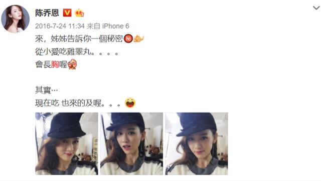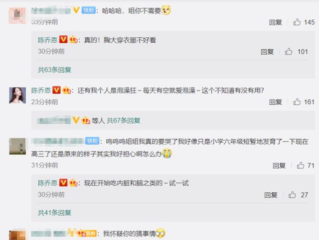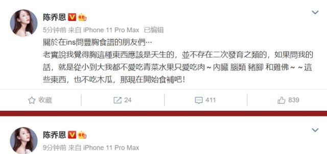 4月22日晚,陈乔恩在微博连发两条微博回答网友的问题,第一条写道:“丰胸食谱⋯⋯有这种东西吗?让我想想”,思考了几分钟后陈乔恩再发文写道:“关于在ins问丰胸食谱的朋友们⋯老实说我觉得胸这种东西应该是天生的,并不存在二次发育之类的,如果问我的话,就是从小到大我都不爱吃青菜水果只爱吃肉~内脏 脑类 猪脚 和鸡佛~~这些东西,也不吃木瓜,那现在开始食补吧!”