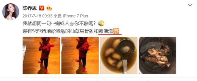 陈乔恩晒爸爸特别为她熬的鸡柳汤
