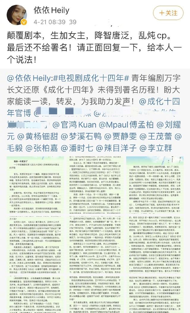 4月21日《成化十四年》的编剧更是被炸出来发万字长文声讨片方颠覆剧本、生加女主、降智男主、乱炖cp、不给编剧署名的"五宗罪",由于投诉无门只能"声嘶力竭"地在社交媒体上要求片方正面回应给个说法。