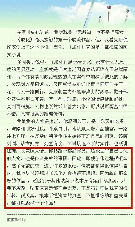 从这位编剧的长文中可以看得出来现在国内编剧的处境实在是艰难,对工作内容的话语权小而且连最自己最基本的权益都得不到保障。不少人都非常的惋惜《成化十四年》这部优秀的小说最终在不珍惜它的人手里没有得到一个好的改编结果。