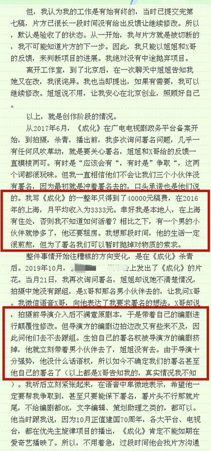 并且编剧称自己写《成化十四年》项目一整年只得4万稿费,平均月收入只有3333元,最终还不配拥有署名权。之后才得知拍摄前由于导演介入不满原剧本,于是又带着自己的编剧进行颠覆性修改,而且导演非常的强势编剧基本没有话语权,最终拍摄的剧本与原版剧本相去甚远最终,在有初稿编剧署名的情况下仍然以所谓的对成片的贡献度考量没有给她署名。