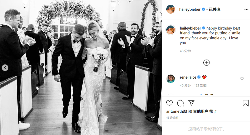海莉在配文写道:“生日快乐,最好的朋友。谢谢你每天都给我带来微笑,我爱你。”