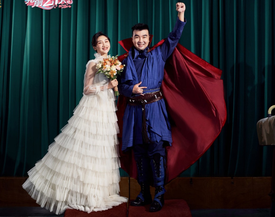 两人深情对视,幸福满满。何雯娜身材姣好,大长腿抢镜。