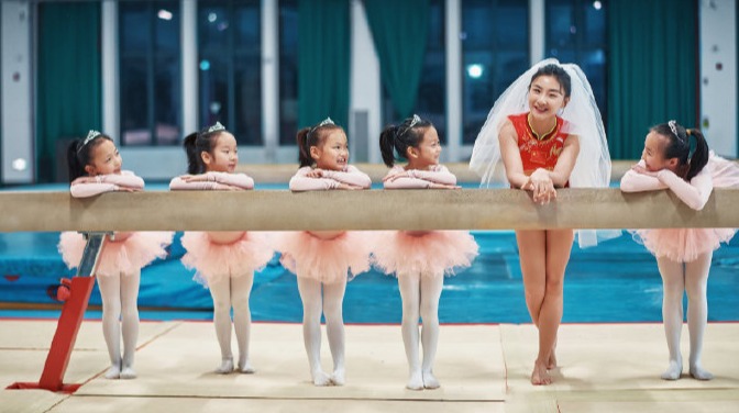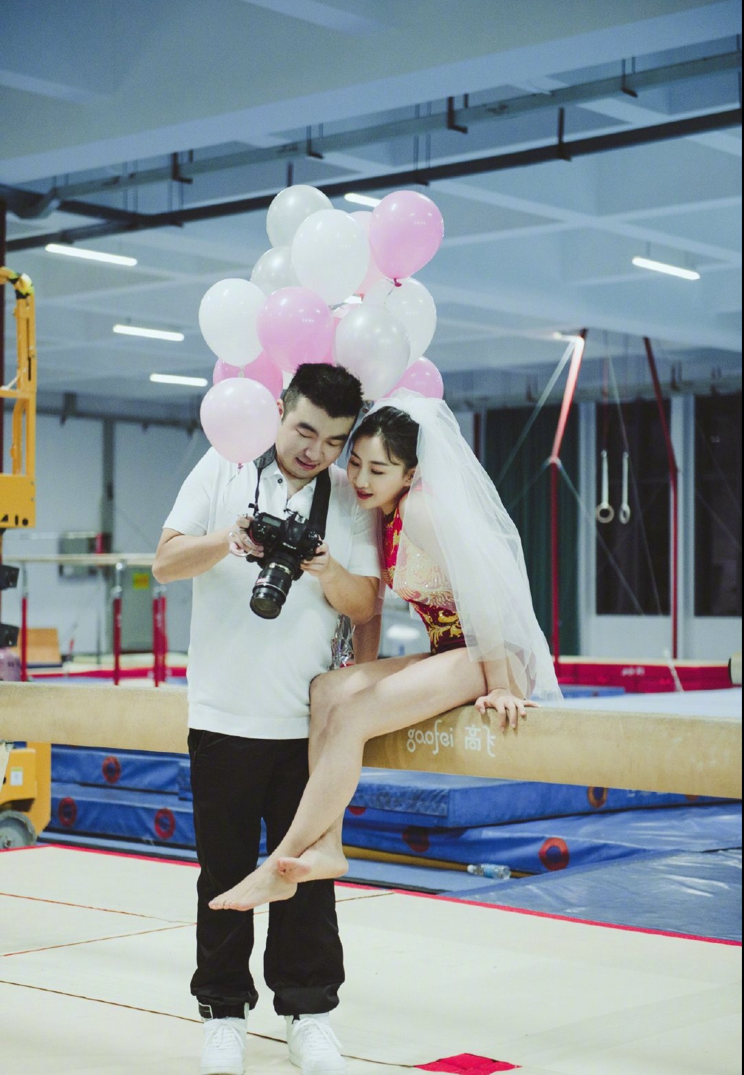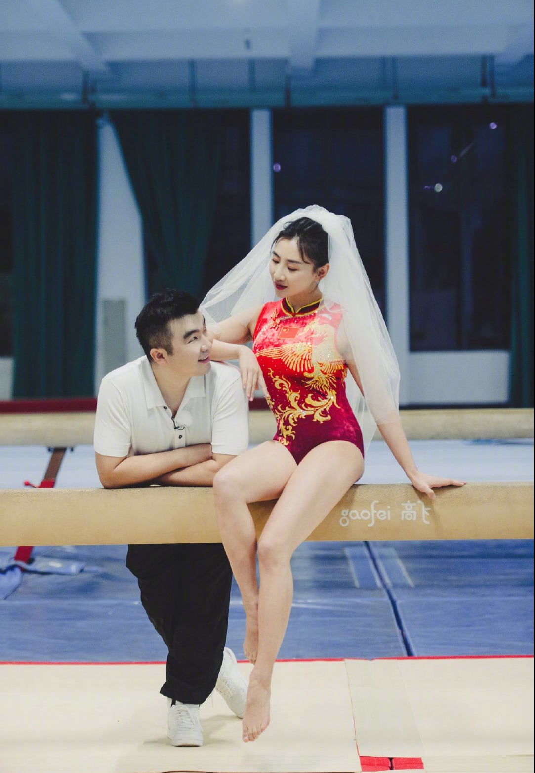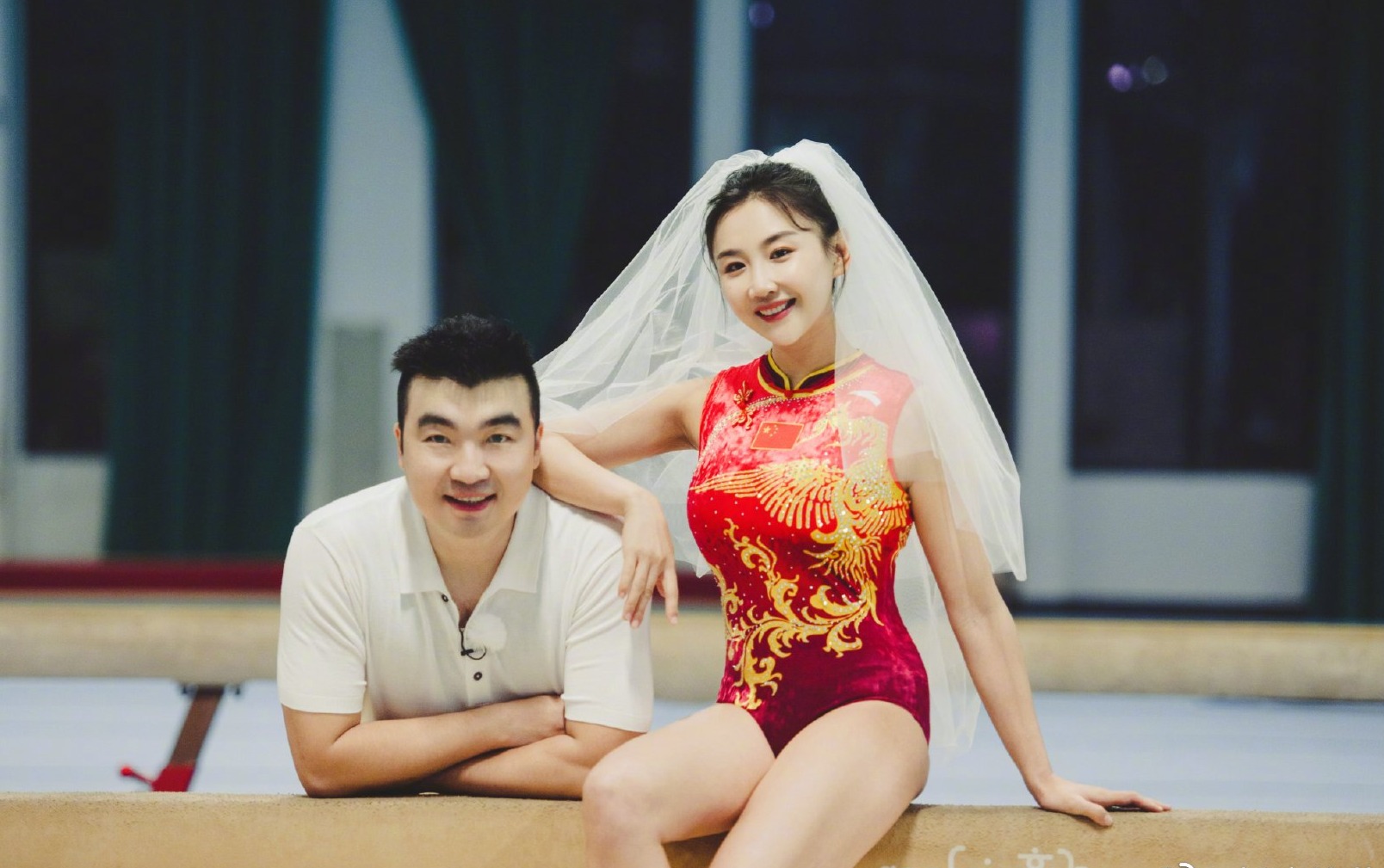 何雯娜穿奥运体操服戴头纱甜笑,大长腿抢镜。