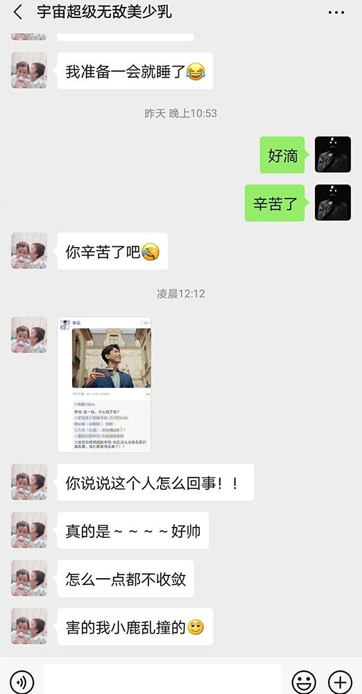 4月21日,王栎鑫在社交平台晒出了他和老婆吴雅婷的对话,吴雅婷将朋友圈里关于李现的广告截图发给他,并抑制不住兴奋直呼“这个人怎么这么帅,一点都不收敛,害的我小鹿乱撞。”甚至在广告下都忍不住留言。