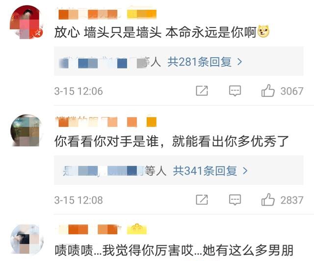 看到此网友回复也特别可爱,安慰王栎鑫说"墙头只是墙头,她的本命永远是你啊",也有人说“还是你厉害,她有这么多男朋友最终还是选择你。”画风突转猝不及防变成了狗粮。