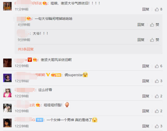 网友们看到后纷纷夸赞道:“俩Superstar”“这么好看”、“哇,好酷”“一个女神一个男神,真的是绝了!”、“谢贤大哥风采依旧啊!”