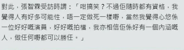 随后张智霖说,刘心悠随时都有资格退出,她是一个好演员、好搭档,是一个有内涵的人,任何事情都可以胜任。